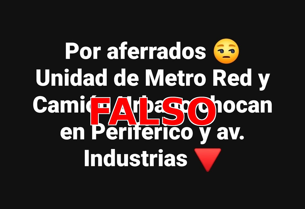 La Secretaría de Comunicaciones y Transportes (SCT) informó que es falsa la versión que circula en algunos medios y redes sociales sobre un supuesto choque entre una unidad de RedMetro y un camión de transporte urbano. La dependencia precisó que los hechos ocurrieron en la Línea 3 Circuito Potosí, en la intersección con avenida Industrias, donde una unidad encontró a una unidad de transporte urbano detenida por una falla mecánica, lo que generó tráfico en la zona.