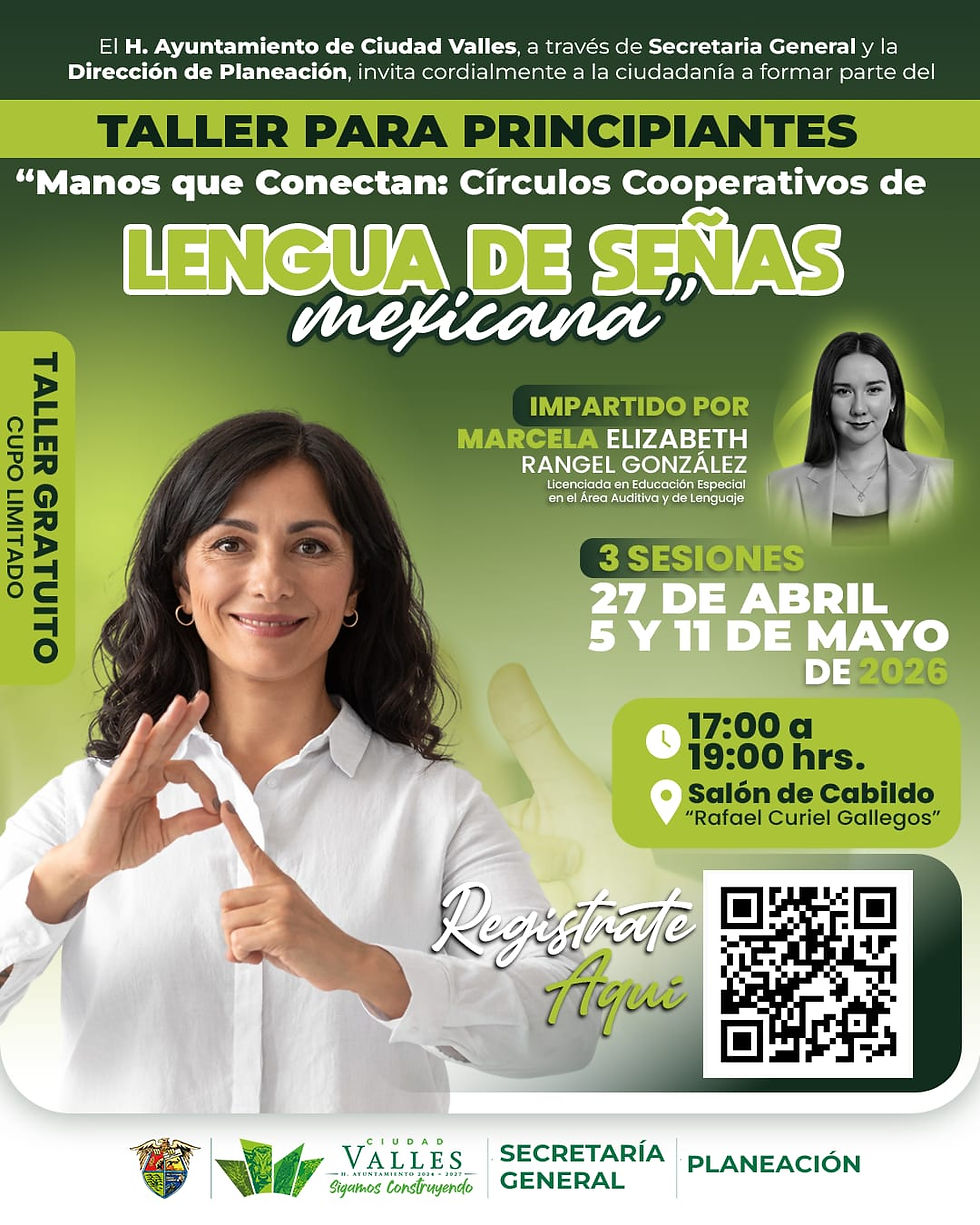 Dando continuidad a las acciones que promueven la inclusión en el municipio, el H. Ayuntamiento de Ciudad Valles, a través de la Secretaría General y la Dirección de Planeación, invita a la ciudadanía a formar parte de los talleres “Manos que Conectan: Círculos Cooperativos de Lengua de Señas Mexicana”, en sus niveles básico y avanzado, con el propósito de fortalecer la comunicación con la comunidad sorda y construir una sociedad más incluyente.